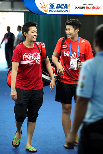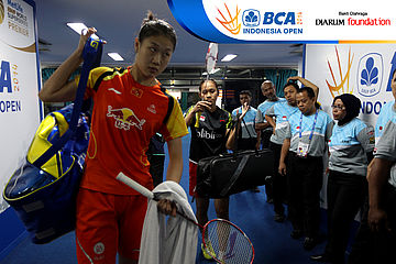 Yu Sun (China) dan Aprilla Yuswandari (Indonesia) bersiap memasuki arena pertandingan