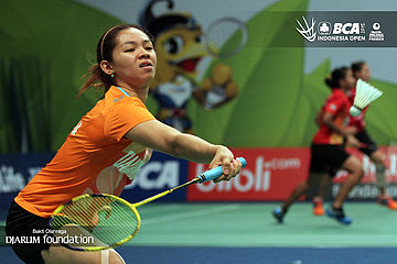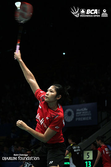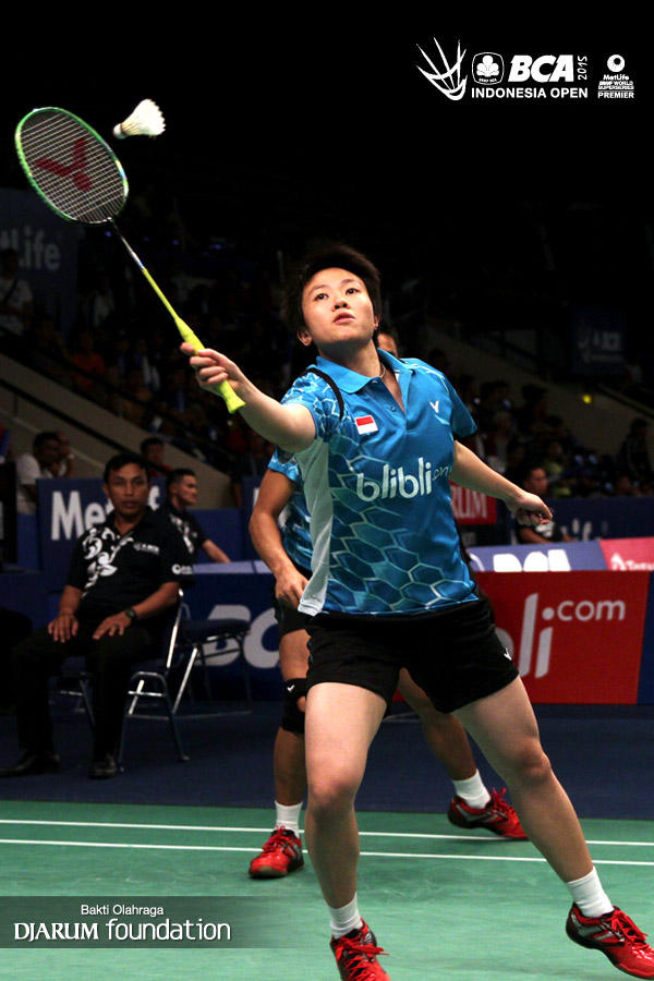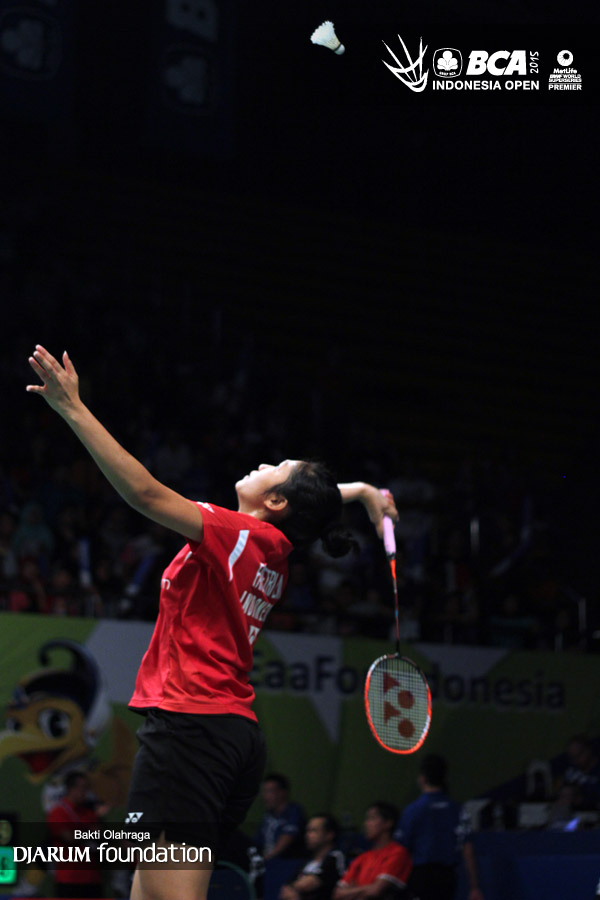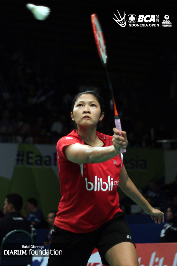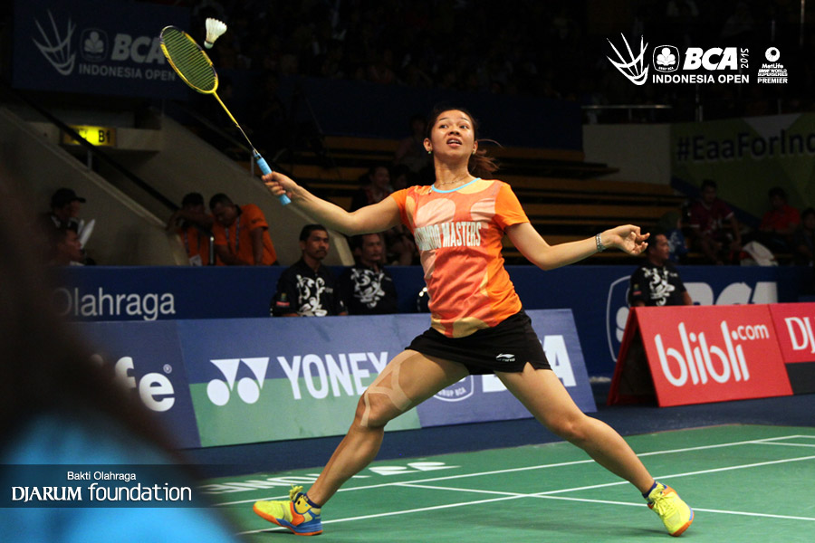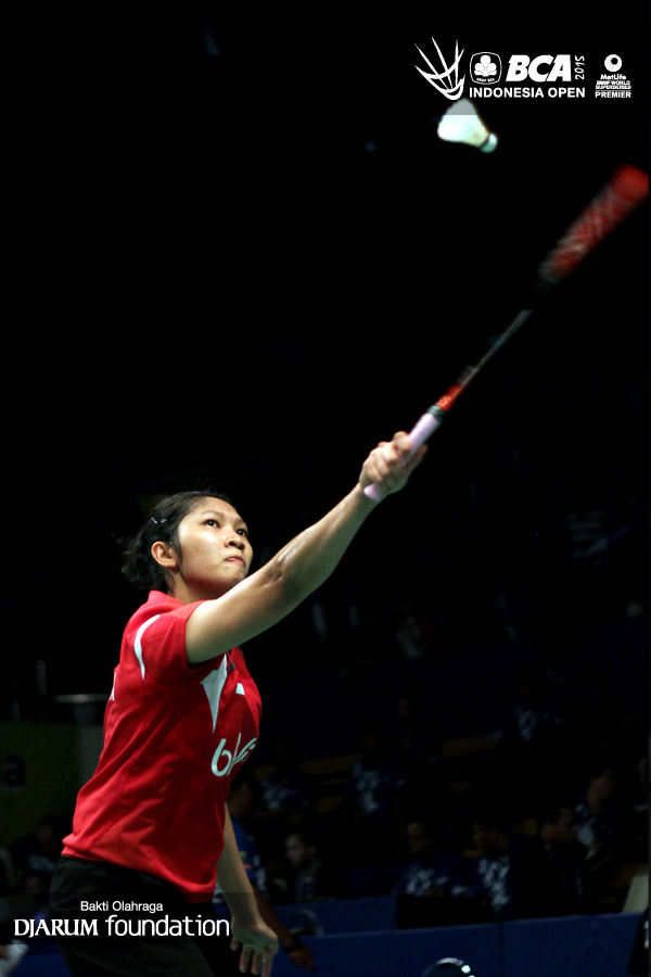Lindaweni Fanetri (Indonesia) menyambut pengembalian dari Gregoria Mariska (Indonesia).