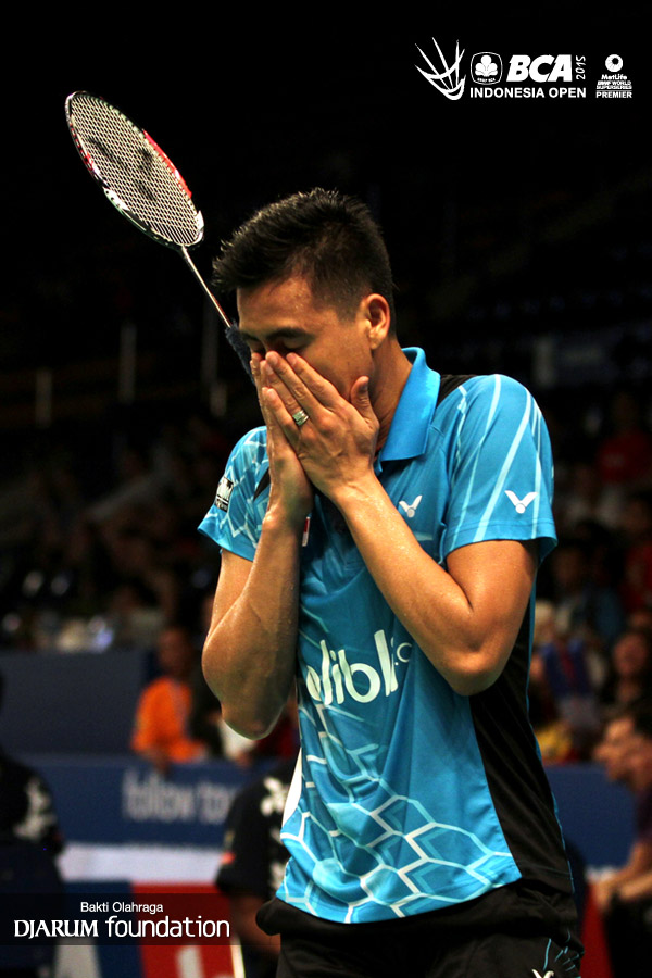 Selebrasi Tontowi Ahmad (Indonesia) setelah berhasil mengalahkan pasangan ganda campuran Korea Selatan, Lee Chun Hei/Chau Hoi Wah.
