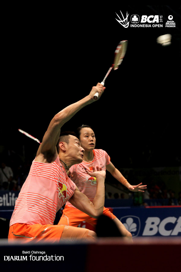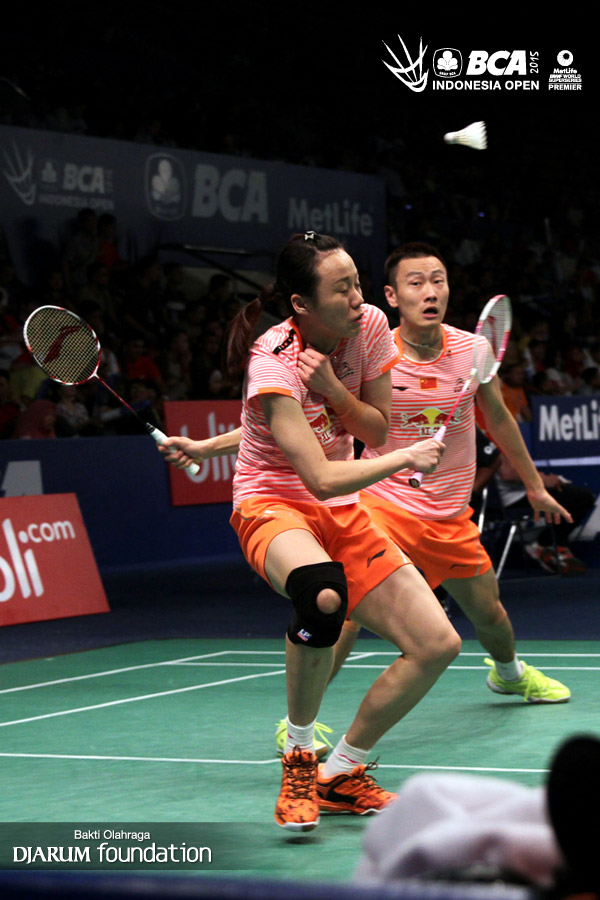 Zhang Nan/Zhao Yunlei (China) bersiap menghadang pengembalian dari Yoo Yeon Seong/Chang Ye Na (Korea Selatan).