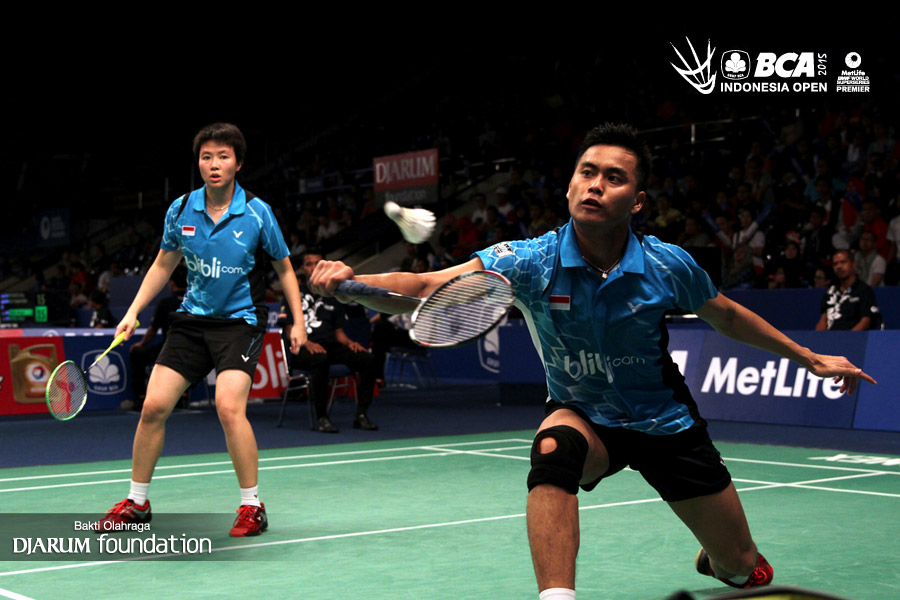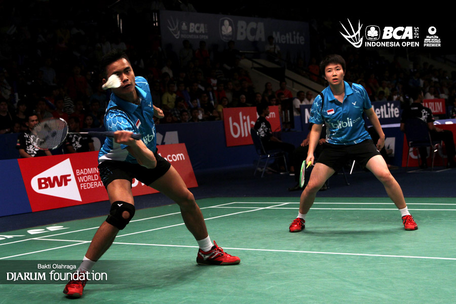 Tontowi Ahmad/Liliyana Natsir (Indonesia) mengembalikan shuttlecock ke arah Lee Chun Hei/Chau Hoi Wah (Korea Selatan).