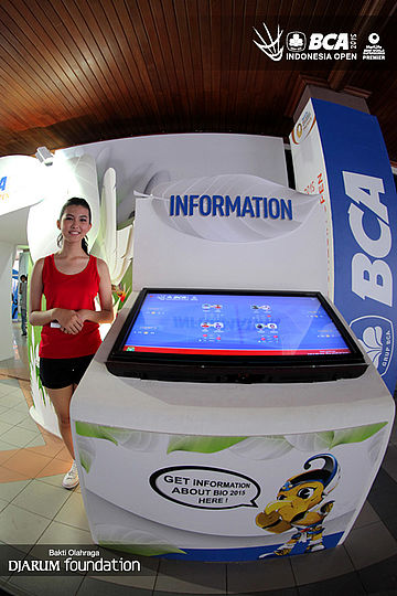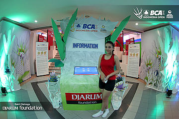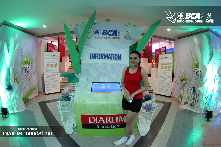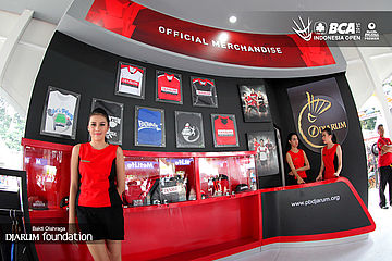 Salah seorang usher berpose di booth merchandise PB Djarum.