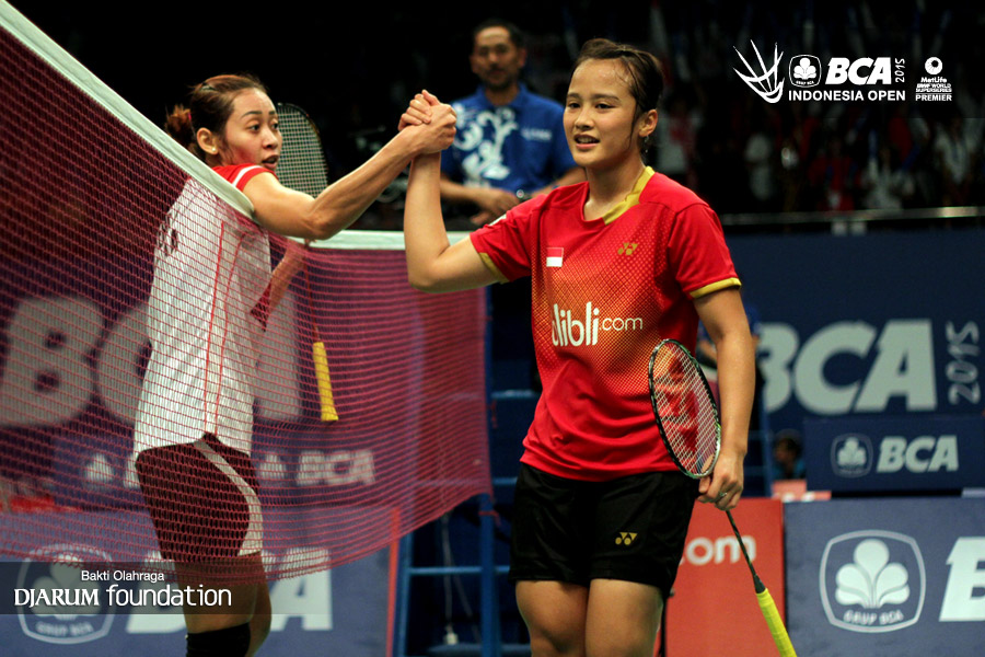 Maria Febe (Indonesia) bersalaman dengan Hanna Ramadhani (Indonesia) usai bertanding.