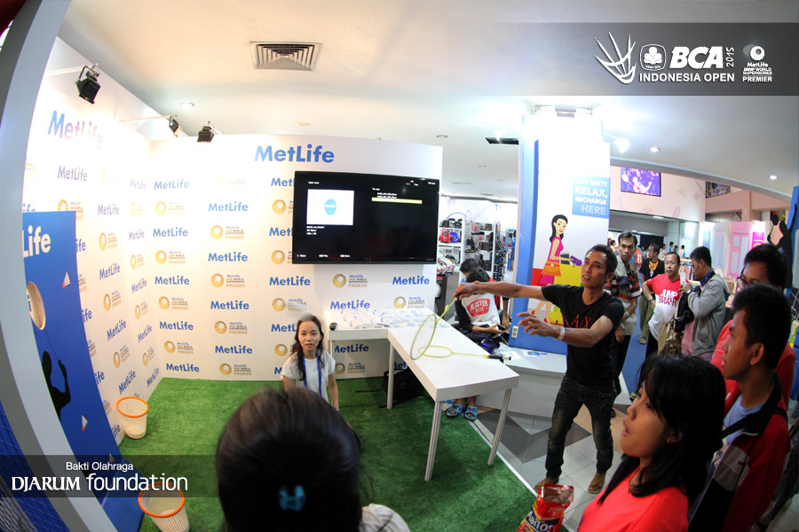 Para pengunjung memenuhi arena games di booth Metlife.