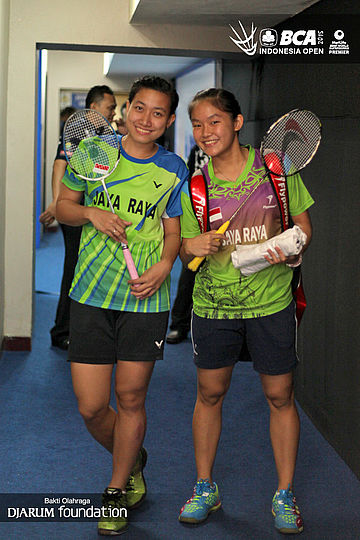 Weni Anggraini/Ruselli Hartawan, berpose sebelum memasuki arena pertandingan.