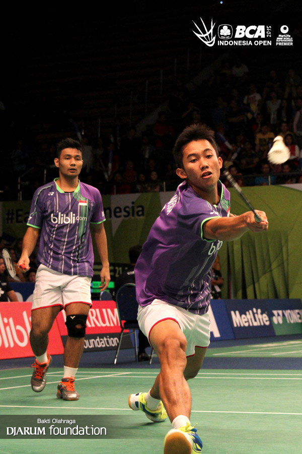 Berry Anggriawan/Ryan Agung (Indonesia) mengembalikan shuttlecock ke arah Jagdis Singh/Wee Long Roni (Malaysia).