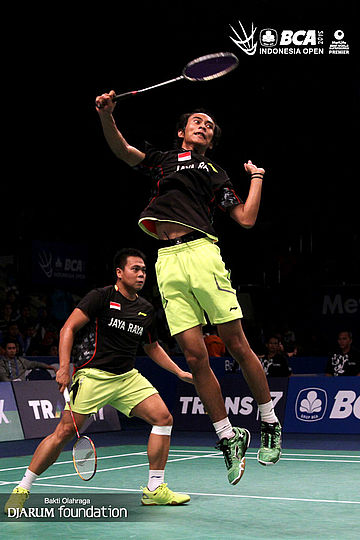 Agripina Prima/Markis Kido (Indonesia) melepaskan smash Lee Yong Dae/Yoo Yeon Seong (Korea).