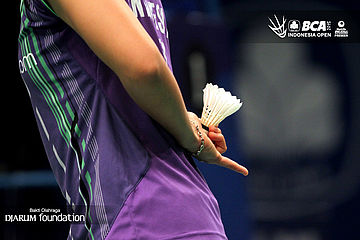 Minatsu Mitani (Jepang) harus terjatuh saat meladeni perlwanan dari Adrianti Firdasari (Indonesia).