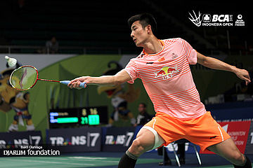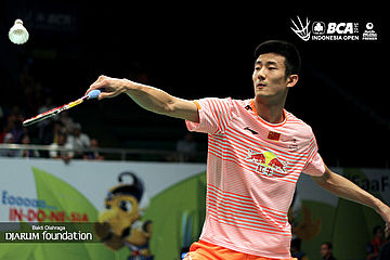 Lin Dan (China) menyambut pengembalian dari Tommy Sugiarto (Indonesia).
