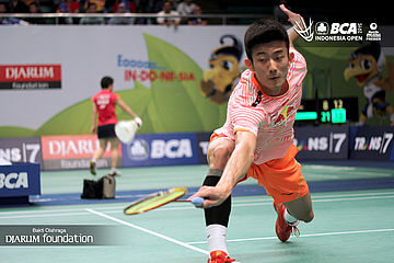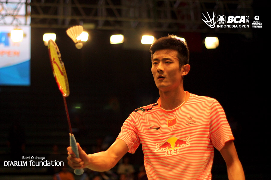 Chen Long (China) mengembalikan shuttlecock ke arah Wei Nan (Hongkong).