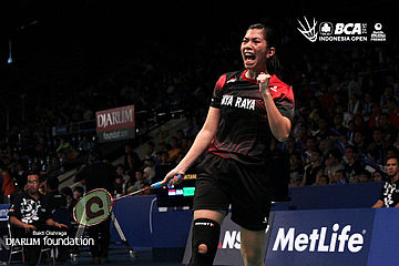 Ekspresi Adrianti Firdasari (Indonesia) saat berhasil mencuri poin.
