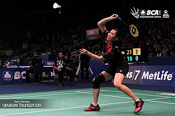 Adrianti Firdasari (Indonesia) meminta pergantian shuttlecock.