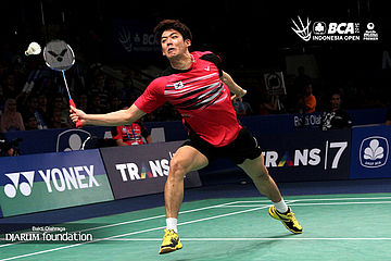 Lee Yong Dae (Korea) menggapai pengembalian dari Agripina Prima/Markis Kido (Indonesia).
