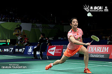 Bae Teon Ju (Korea) menggapai pengembalian dari Wang Shixian (China).