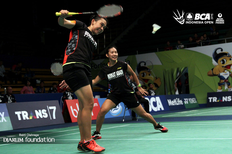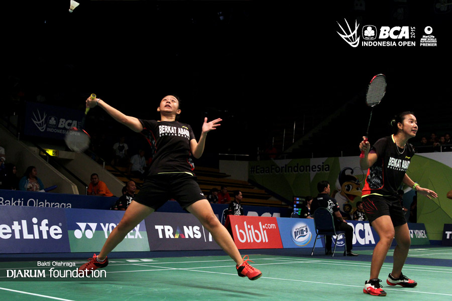 Devi Tika Permatasari/Keshya Nurvita Hanadia (Indonesia) menghadang serangan yang dilepaskan Christinna Pedersen/Kamilla Rytter Juhl (Denmark).