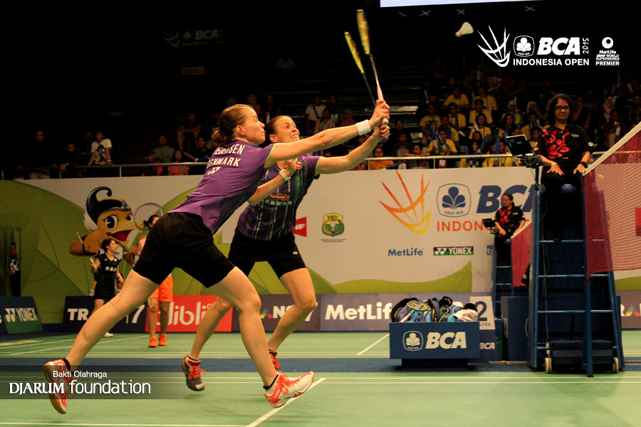 Christinna Pedersen/Kamilla Rytter Juhl (Denmark) menyambar pengembalian tanggung dari Devi Tika Permatasari/Keshya Nurvita Hanadia (Indonesia).