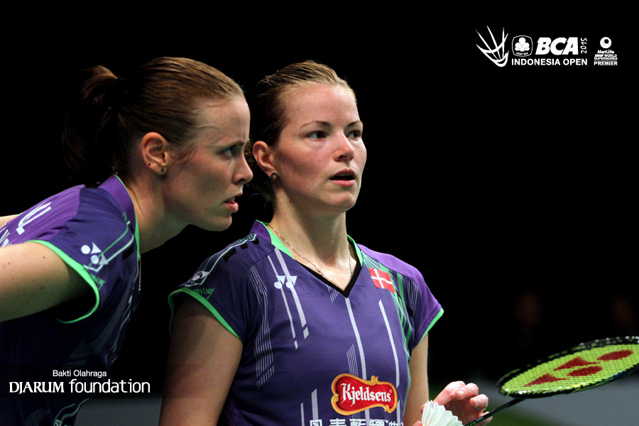 Christinna Pedersen/Kamilla Rytter Juhl (Denmark) menyambut pengembalian dari Devi Tika Permatasari/Keshya Nurvita Hanadia (Indonesia).