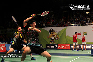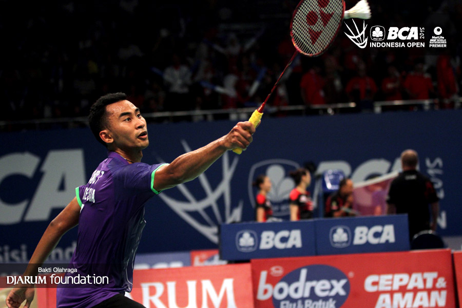 Tommy Sugiarto (Indonesia) mengembalikan shuttlecock ke arah Marc Zwiebler (Jerman).