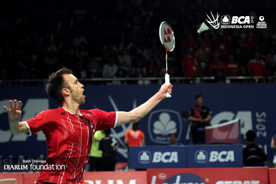 Marc Zwiebler (Jerman) menyambut pengembalian dari Tommy Sugiarto (Indonesia).
