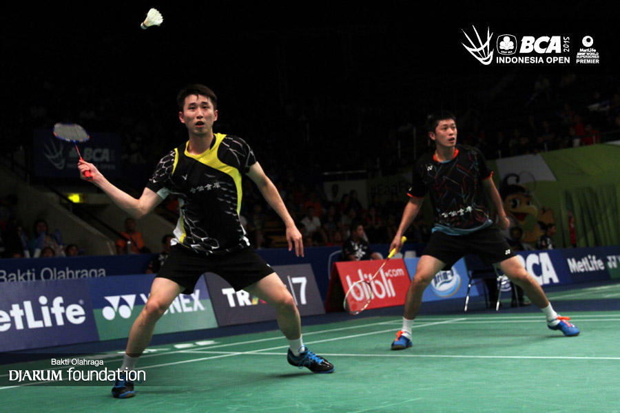 Lee Sheng Mu/Tsai Chia Hsin (China Taipei) bersiap menyambut pengembalian dari Ko Sung Hyun/Shin Baek Choel (Korea).
