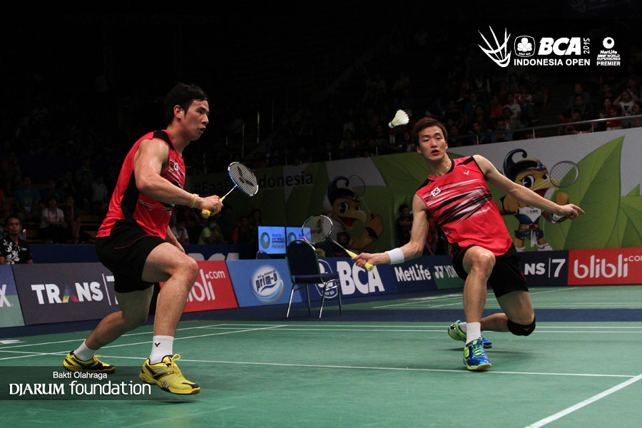 Lee Sheng Mu/Tsai Chia Hsin (China Taipei) mengembalikan shuttlecock ke arah Ko Sung Hyun/Shin Baek Choel (Korea).