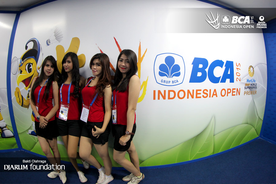 Para usher berpose di pintu masuk utama BCA Indonesia Open Super Series Premier 2015.