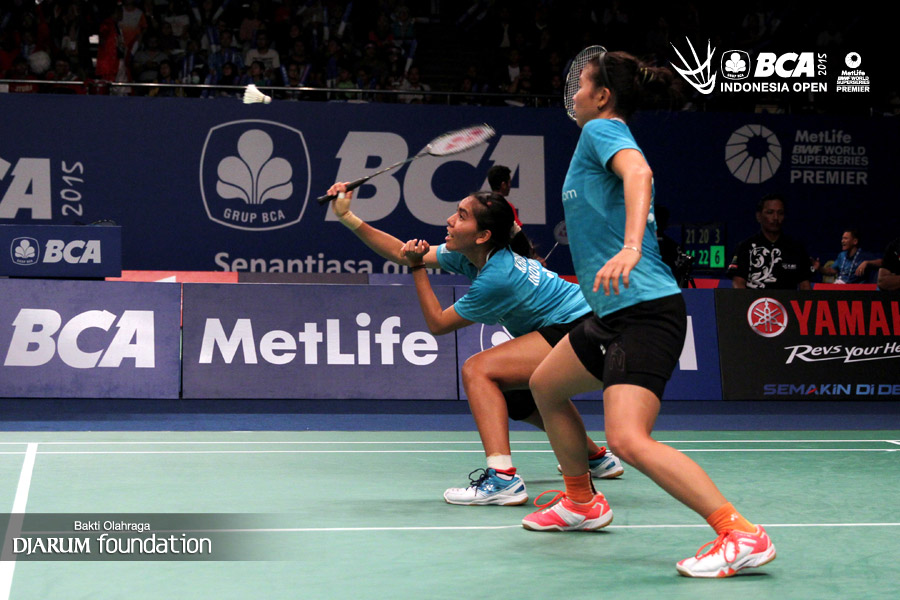 Greysia Polii/Nitya Krishinda (Indonesia) menghadang serangan yang dilepaskan Puttita Supajirakul/Sapsiree Taerattanachai (Thailand).