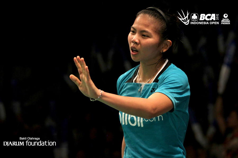 Puttita Supajirakul/Sapsiree Taerattanachai (Thailand) saling berkomunikasi dilapangan pertandingan.