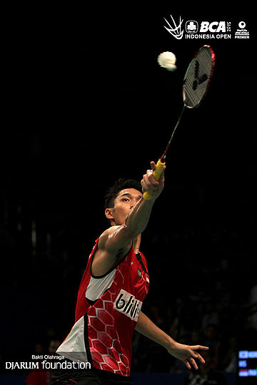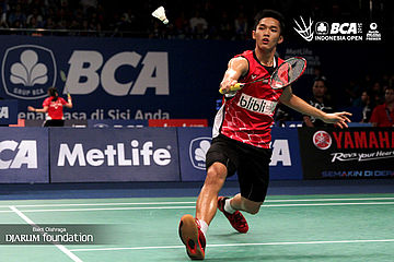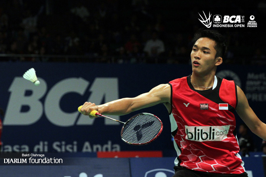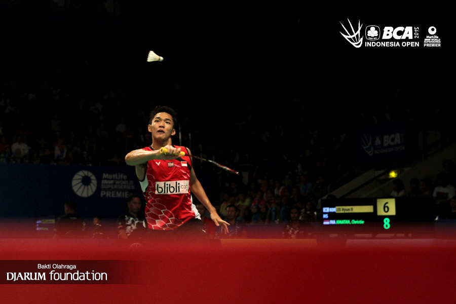 Jonathan Christie (Indonesia) mengembalikan shuttlecock ke arah Lee Hyun Il (Korea).