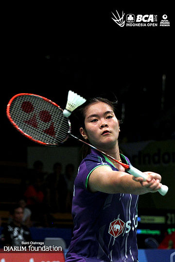 Busanan Ongbumrungpan (Thailand) mengembalikan shuttlecock ke arah Ratchanok Intanon (Thailand).