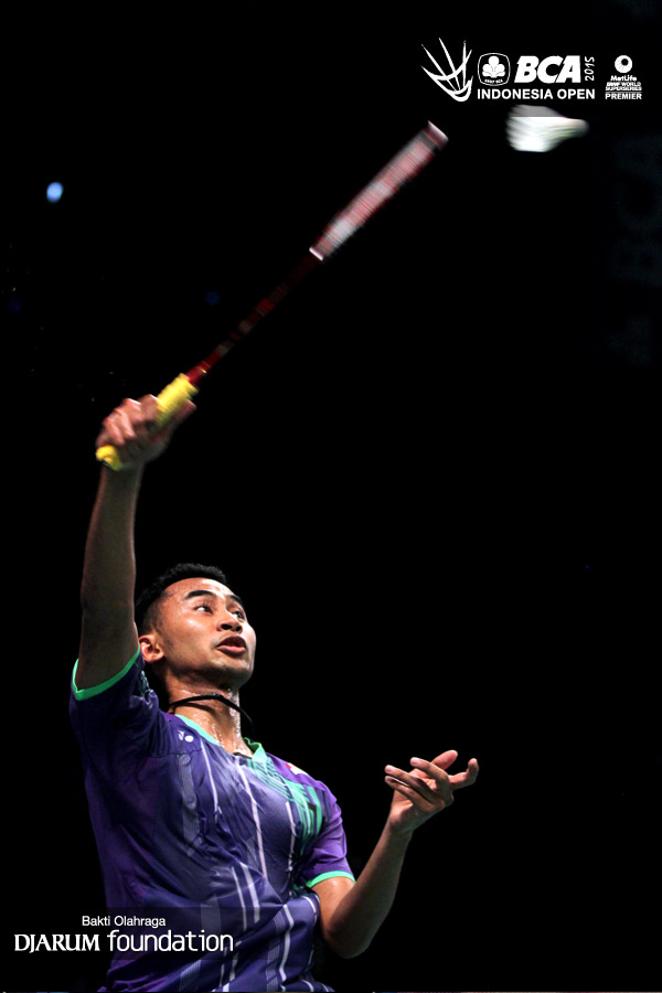 Tommy Sugiarto (Indonesia) melepaskan smash ke arah Marc Zwiebler (Jerman).