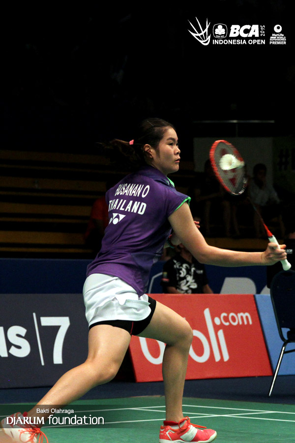 Busanan Ongbumrungpan (Thailand) menghadang serangan yang dilepaskan Ratchanok Intanon (Thailand).