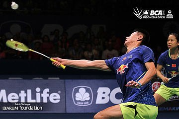 Xu Chen/Ma Jin (China) mengembalikan shuttlecock ke arah Zhang Nan/Zaho Yunlei (China).