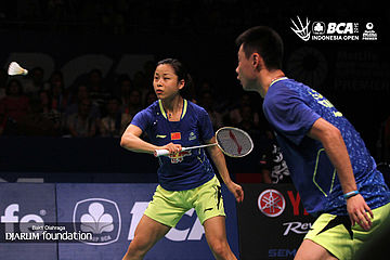 Xu Chen/Ma Jin (China) saling berkoordinasi dilapangan