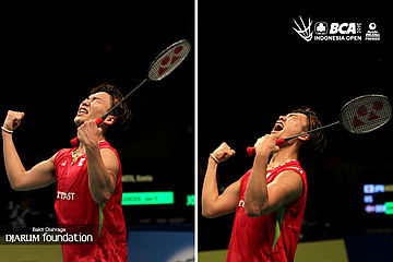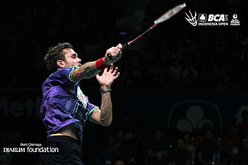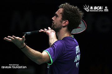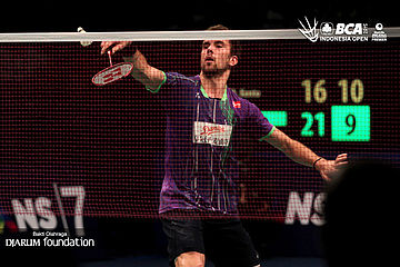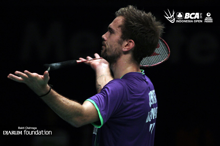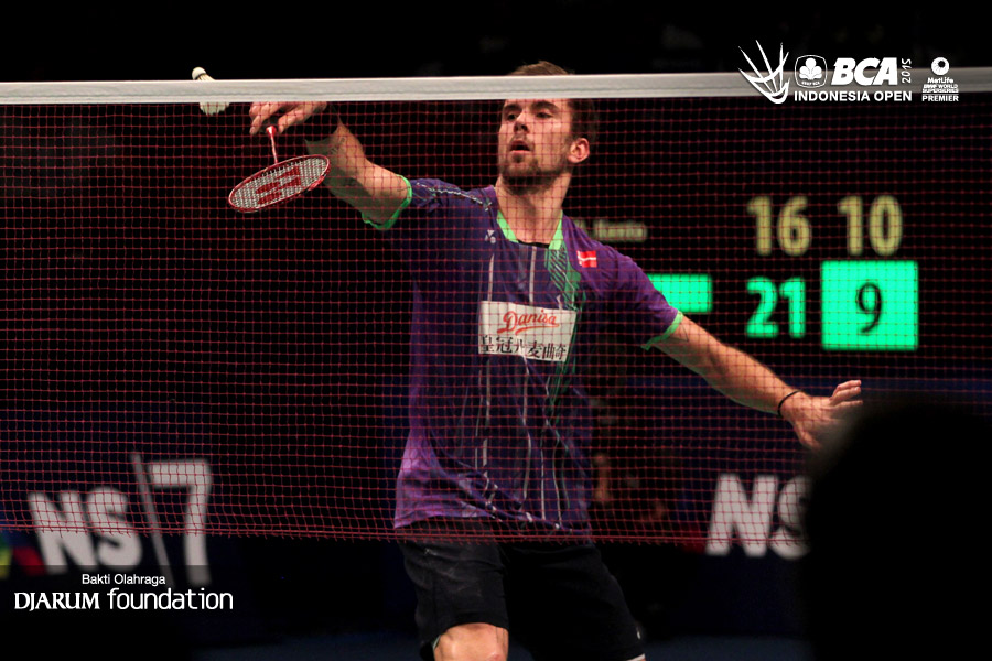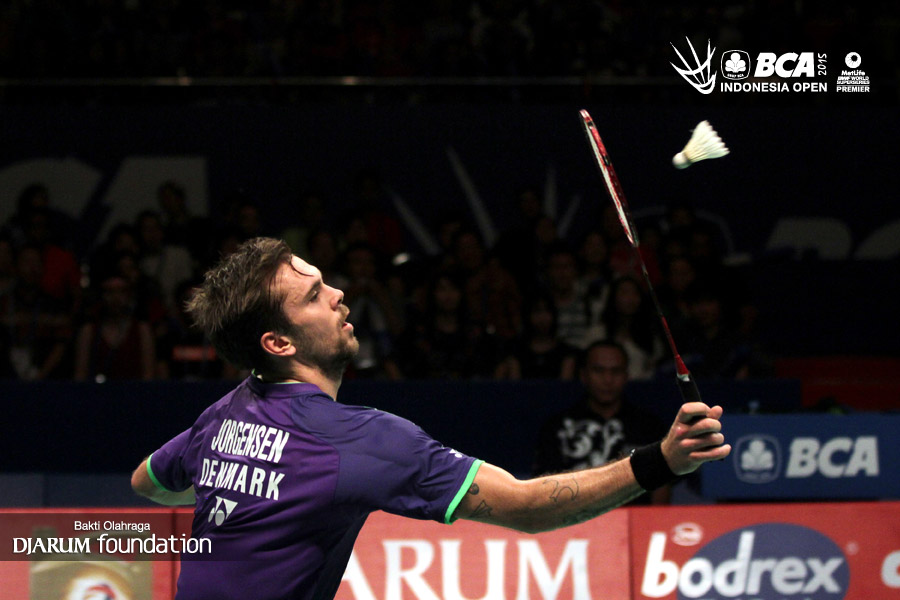 Jan O Jorgensen (Denmark) mengembalikan shuttlecock ke arah Kento Momota (Jepang)