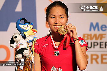 Ratchanok Intanon (Thailand) menggigit medali saat di podium juara
