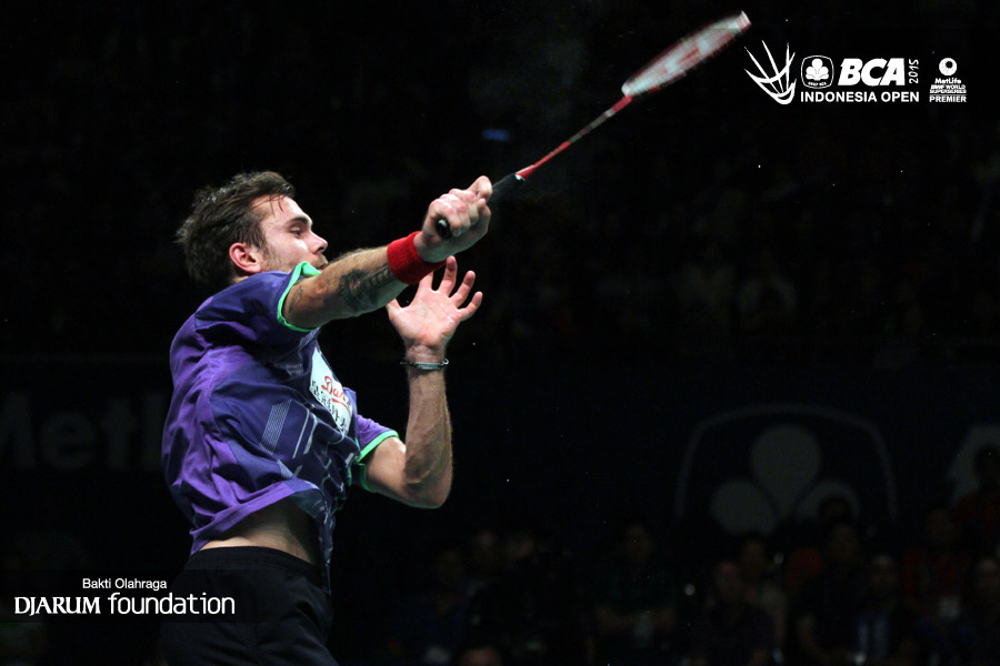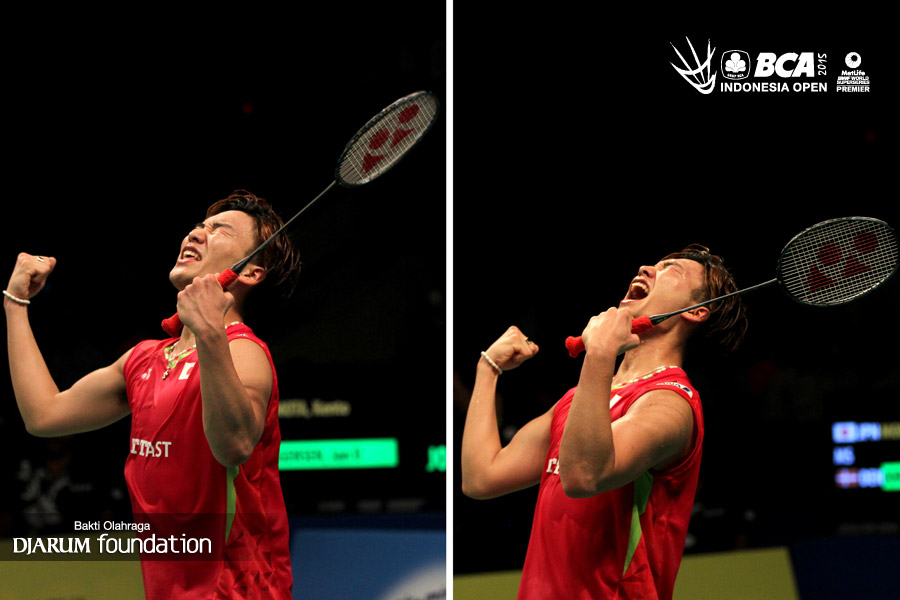Jan O Jorgensen (Denmark) melepaskan serangan ke arah Kento Momota (Jepang)