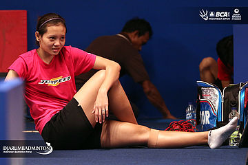 Liu Ying Goh (Malaysia) mendapatkan perawatan fisiotrapis sebelum berlatih