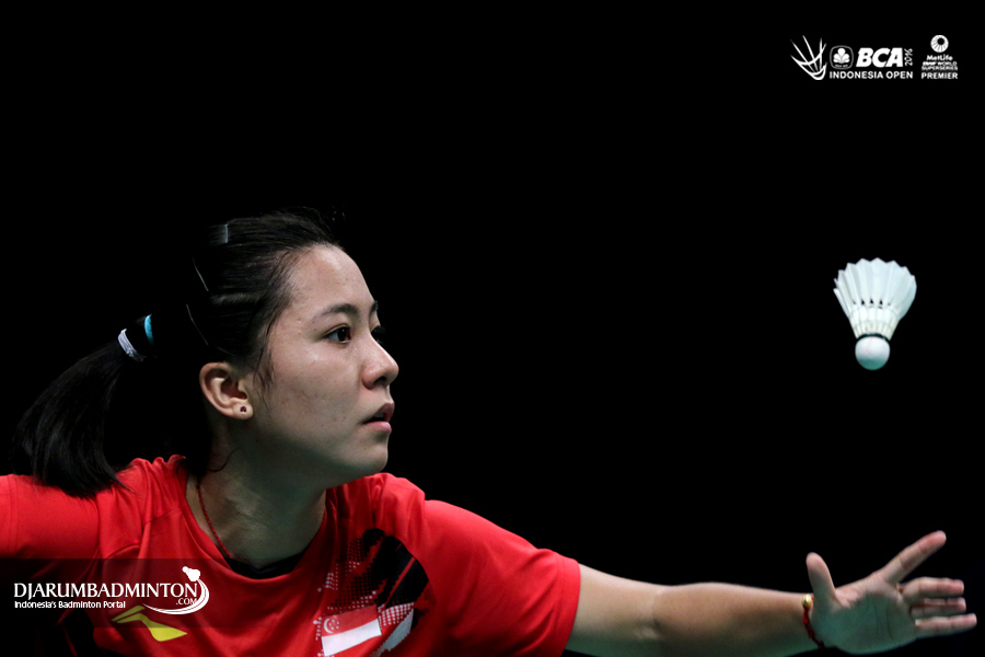 Xiaoyu Liang (Singapura) melepaskan serve