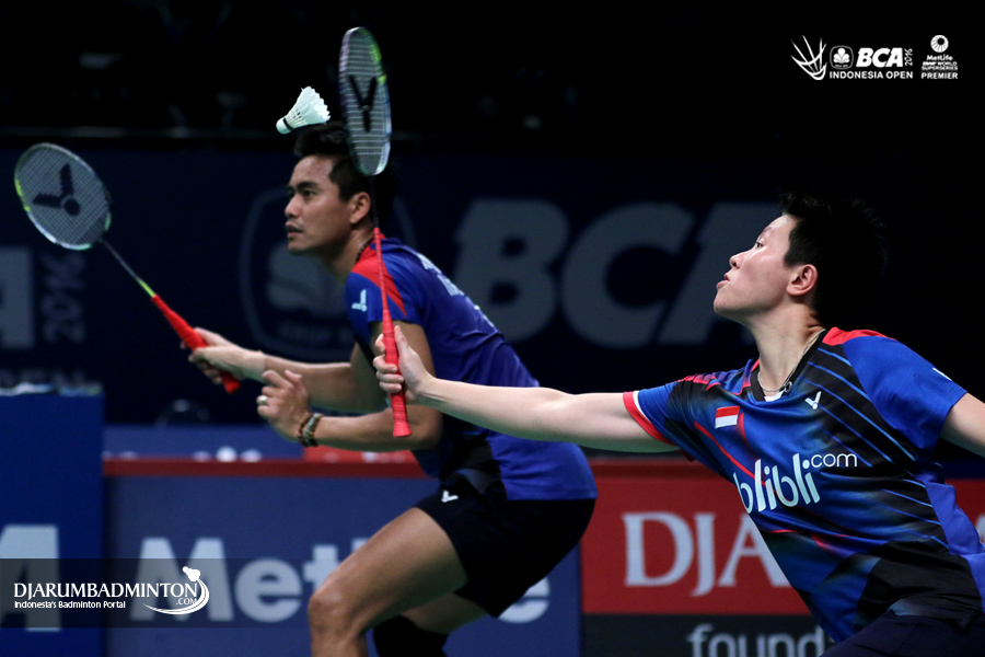 Tontowi Ahmad/Liliyana Natsir (Indonesia) mengembalikan shuttlecock