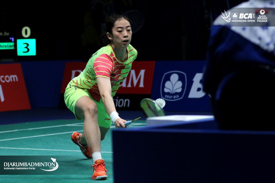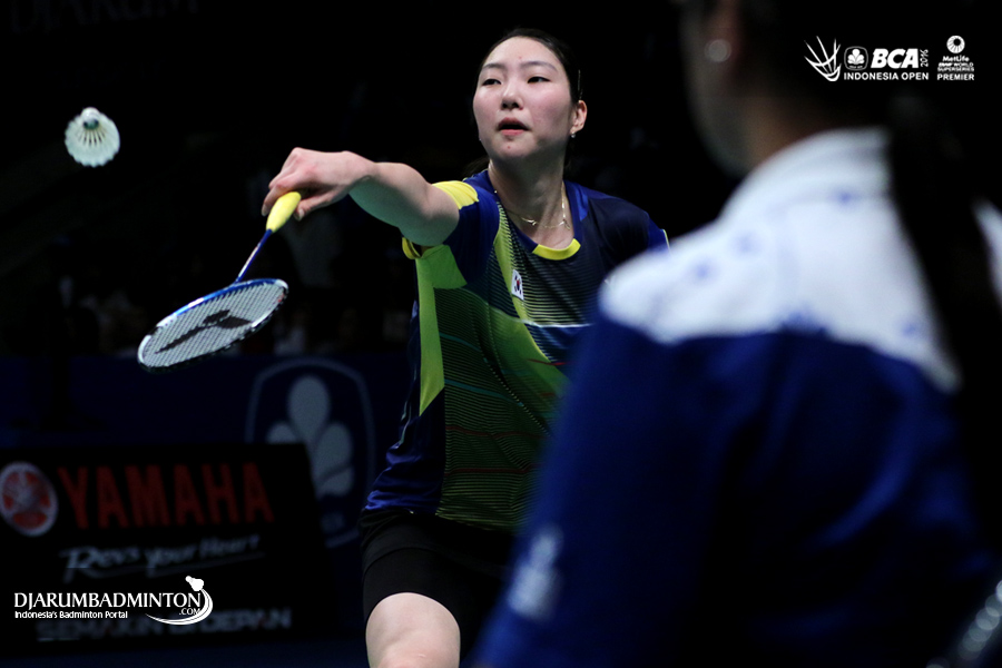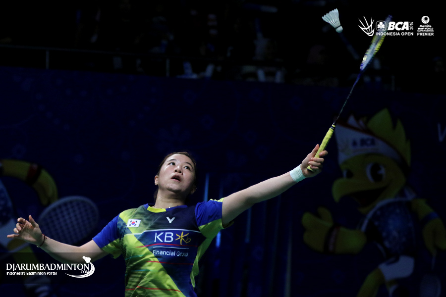 Sung Ji Hyun (Korea) mengembalikan shuttlecock
