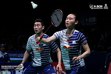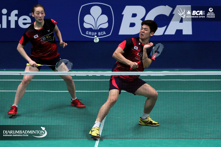 Lee Yong Dae/Lee So Hee (Korea) mengembalikan shuttlecock