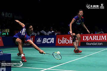 Alfian Eko/Annisa Saufika (Indonesia) mengembalikan shuttlecock