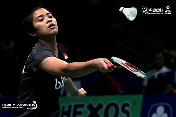 Gregoria Mariska (Indonesia) mengembalikan shuttlecock
