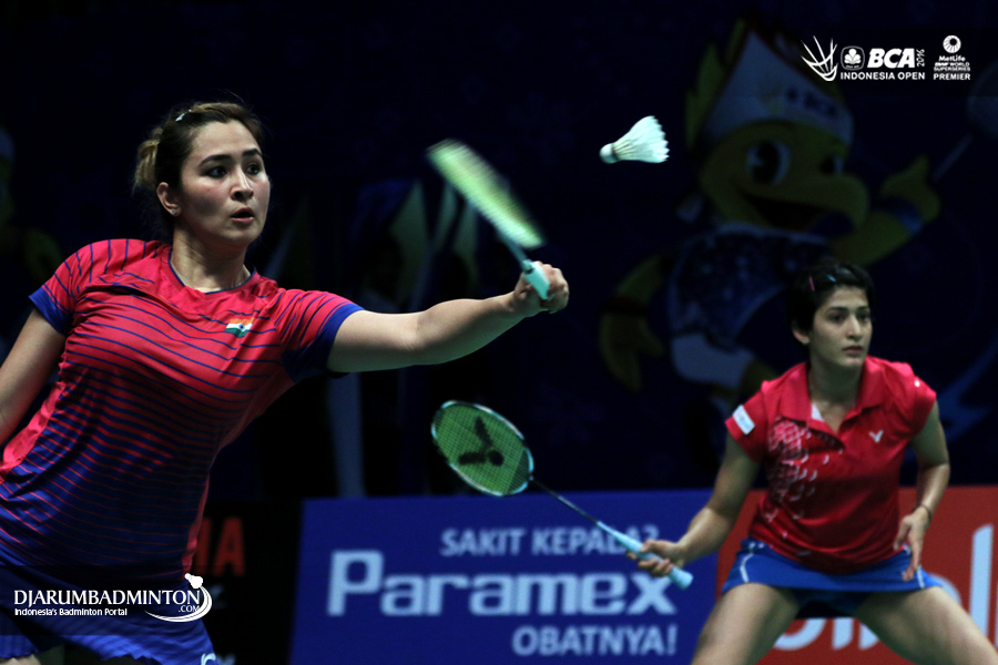 Ashwini Ponnappa/Jwala Gutta (India) menghadang serangan