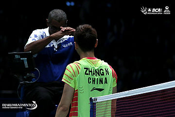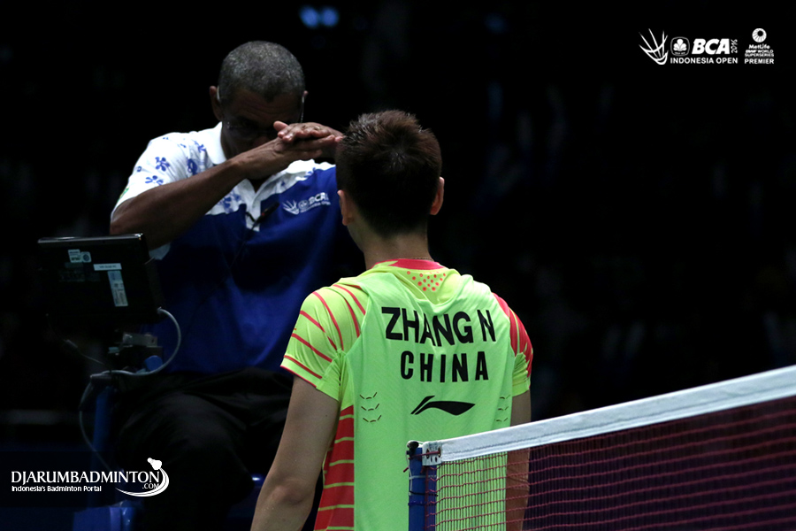 Zhang Nan (Tiongkok) melakukan protes kepada Umpire