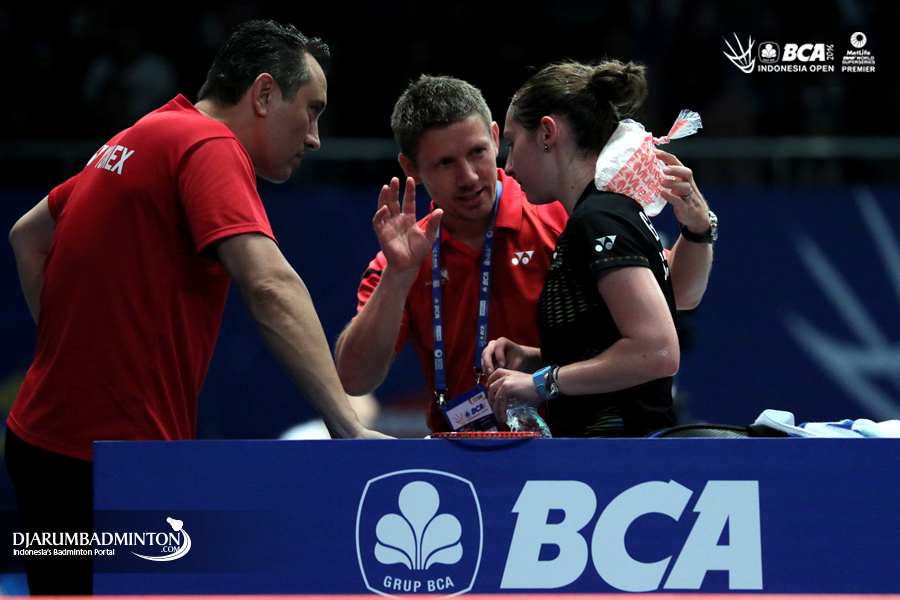 KristyGilmour (Skotlandia) mendapatkan pengarahan dari pelatih