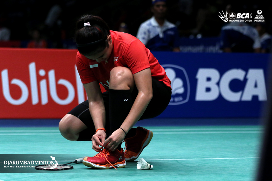 Anggia Shita Awanda (Indonesia) mengikat tali sepatu