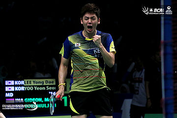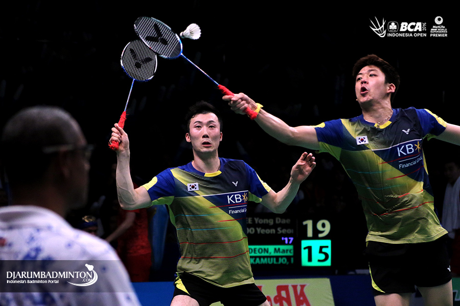 Lee Yong Dae/Yoo Yeon Seong (Korea) menghadang serangan