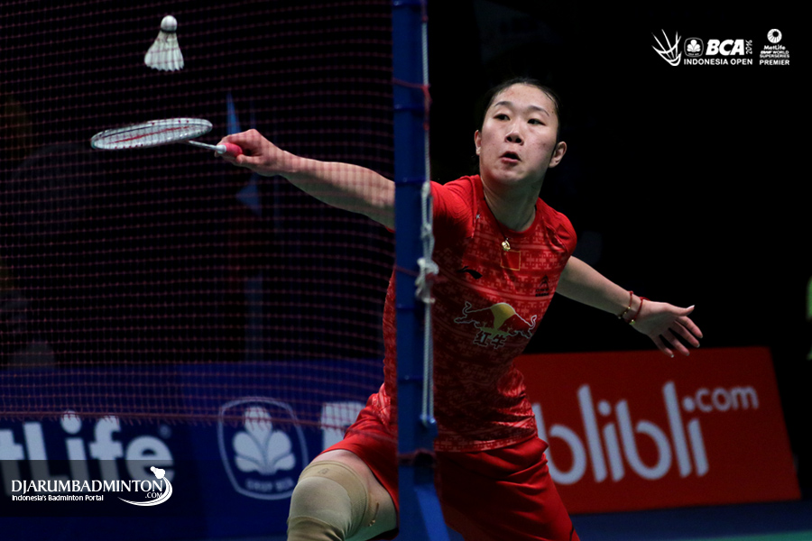 Sun Yu (Tiongkok) mengembalikan shuttlecock